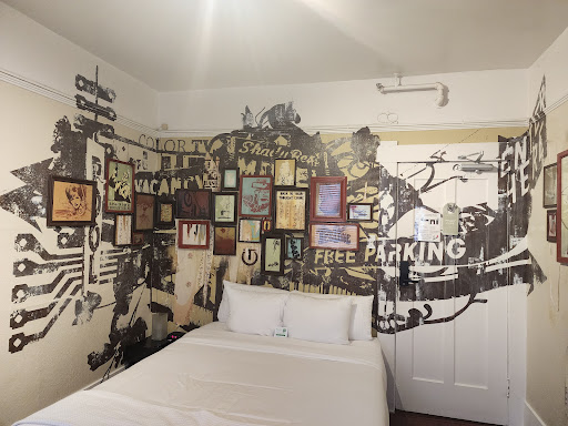 I have traveled all over the world and stayed in some really unusual, unkept hotels and hostels. I have never felt uncomfortable staying in my hotel room before I stayed at the Hotel Des Arts. This hotel, however, is without question, the worst hotel room I have ever stayed at in my life. From the front desk person who just stood there and watched me struggle trying to open the locked front door, to the death trap elevator that takes five minutes to go five floors, to the electronic key app that didnât work on my door, all these things I could move past. The room, however. No. Absolutely not. When I first walked into the room I honestly thought that it was a leftover unfinished room from when the building had been a crack house. ||||Now I understand that art is subjective and I LOVE art, and even have graffiti pieces in my person collection. This room however, is not that. It felt like someone had been on meth and locked themselves in for a month. There were naked women on every wall, profanity, vulgarities⌠things that you would NOT want a child to see, just on every wall including the ceiling. It was a room full of bad energy and chaos. I was greatly uncomfortable. The only way I can describe it is that I paid $200 a night to sleep in a back alley in the worst part of the city. And yes, I asked for another room, all booked up. No can do. ||||Now, that may be your style. You may love the kind of art that makes you queezy and on edge, but that is not the only issue with this hotel. Just the most obvious. Hereâs a few other things wrong with this hotel:||||1. The bed. Being the cheapest model they could find, was so stiff it felt like you were laying on an eggcrate over plywood, with the exception of the large steel beam going right down the middle of the bed that you really felt dig into your back anytime you tried to move. I was in the navy on a boat and this bed was 10x worse than that. ||2. No AC/heat. This is not a nice new hotel building. This is an old old SF building and while nice hotels put in those amenities for their guests, this hotel feels itâs fine that you sweat in your room while sitting still. ||3. Ventilation. There was one window in the room. It opened onto an enclosed lightwell with a bunch of the other rooms and the cackling girls from the other rooms filled that entire space and permeated my hotel room even with the window closed. The window which had broken blinds and no screen so, you know, bugs flying in. Also, no window in the bathroom which Iâm pretty sure is a violation. ||4. There were holes in the walls. ||5. There was an electric cord coming out of the wall going to nothing just dangling out of the wall. ||6. The only plug I had to use was a multi-prong extension cord just laying on the floor under the desk. ||7. The art didnât cover everything so there were just patches of drywall and unpainted walls. ||8. Iâm pretty sure someone died in the closet since it looks like a serial killer hiding space.||9. The furniture (nightstand and desk) felt like they had been found discarded on the street and put into the room. Scuffed and ugly and very old. The plastic chair was uncomfortable and honestly I felt like I was going to break it at any moment. ||10. Obviously, there were no amenities like a mini fridge, a countertop or a phone to call the front desk, which makes sense as there was never anyone at the front desk for the entirety of my stay after my initial entry. Also, I never found out where the ice machine was as there was no one to ask and no signs. ||11. The bathroom looked half-finished like the meth head finally got evicted before he could finish. ||12. If you sat on the toilet the tp roll and wall were so close you had to lean into the bathtub just to wipe your ass. ||13. Speaking of the bath⌠the shower. Big step out of it, bigger than it looks, easy to trip and fall out of. And the showerhead was literally at the same level as my nipples. ||14. While all the rooms are themed I could not help but notice that the room they gave me is not shown on their website anywhere. In fact the room that I booked on their website looked beautiful, as did a lot of the other rooms they showed on their website. Lovely looking rooms. That is not what I got, and they have no obligation to give you what you think you booked. You book the size of the room, not the theme. So if you are looking at their website hoping to pick a specific themed room, you have zero control over what you get. ||||Overall, while the art placed all around the hotel was absolutely beautiful, it does not make up for the experience of being in that horrid hotel room. This is not a place I will ever stay again even if I get promised the actual room that I booked as there are no employees on site to make the experience better. This was a âcheap for SFâ room and now I know why. If you get a hotel so you can have a peacefully place to stay while away from home, do yourself a favor and avoid this hotel, it is not what it...