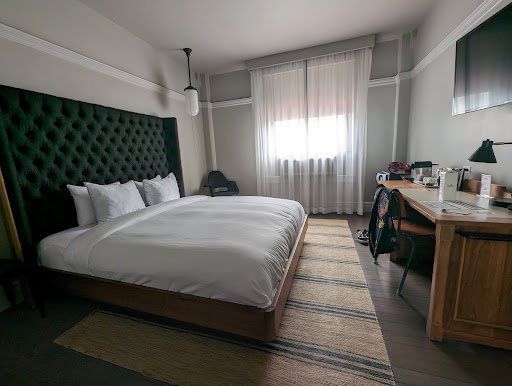The room itself was spacious and comfortable (we stayed in a room with a standard King) and the bathroom was luxurious with a rain shower head. I'm a hot sleeper so I had the A/C on during our entire stay with no issue and no loss of sleep - it kept the room very comfortable and was no noisier than any other window-unit A/C. Even the concrete floors (which from the reviews, I was very worried about) were very nice and smooth on our feet. It is not rough, unfinished concrete, and even my partner who is very sensitive to textures and cold did not mind it. (And again, free slippers 🙂)