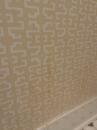 He raised his voice at us several times, refused to give us the name of the general manager so that we could speak with them about our experience. The room was filthy, the carpets were stained and looks like they hadnât been vacuumed or cleaned in some time. There were food stains B running down the wallpaper in the restroom, and the wallpaper was peeling from the wall. The bedspread had brown stains all over it