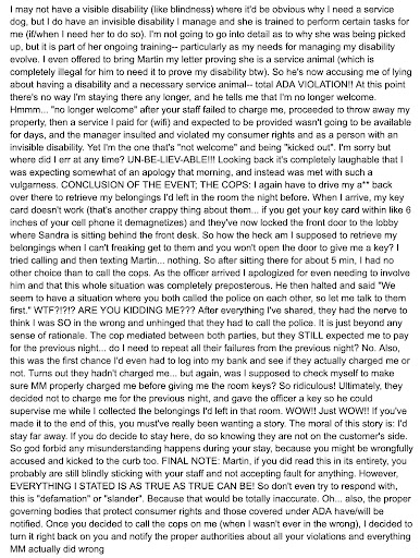 This is a 5 part review; see attached photos: Buckle up for what I'm about to share because before staying at MM I couldn't have even fathomed the unfair, hugely reactionary, completely aggressive treatment I experienced from one of their team members AND the manager. Assuming you don't want to read the entirety of what I've shared below, basically: they have no WiFi, accused me of trying to skip out on my bill (when I was told my card was on file & Iâd been charged for my stay), refused to listen to me, threw away my property, locked me out of my room and called the cops after Iâd done NOTHING wrong, & violated my rights as an individual protected under ADA by accusing me of lying about my invisible disability and my need for a service animal. Read on & you can judge for yourself if this is a place you want to stay. But honestly, do yourself a favor because after getting the heck out of MM I found MUCH NICER and more modern places to stay in the neighborhood for FAR LESS. Either way, since the manager REFUSED to let me get a word in edgewise to explain how misinformed he was, I'll go ahead and air it all below. NOTE: This is a "family run business" which apparently means they only believe their own, won't even hear their customers out to even consider any wrong doing on their part, and then lock their customers out. FIRST: My situation is unique because after my initial AirBnB reservation, I had follow up reservations while my home was under construction after discovering mold growing in my bedroom wall. I am an SF resident (live about a mile from MM) who just wanted the basics and a simple place to stay. I was also self-aware enough at the start of my stay to recognize I was coming out of a hugely stressful situation at home, and therefore I wanted to be extremely mindful of my interactions with the staff and never let my stress at home pour-over into any of my communications. SECOND: They immediately left me an AirBnB review after completing the first of my back-to-back my stay which states: "Wonderful guest! Communicated clearly and promptly, respected our property, and left the room in great condition. We would be happy to host again in the future." So know that I'm not some snooty guest that expects perfection from my hosts and then complains if I don't have the idyllic stay. I'm assuming they've taken down the review they left me because I waited to post my review (not realizing they'd be able to remove/edit theirs until I left mine), otherwise I'd suggest you read it. THIRD: As someone who tries to be as self-aware and empathetic as possible, after the utter disrespect I experienced I STILL tried to put myself in the manager's shoes to contemplate what could've possibly gone wrong. After doing so, I couldn't come up with anything other than I asked for a bill adjustment and the manager agreed to do so. Even if MM found me to be a nuisance for some reason, it in no way warranted their response by violating my rights as a consumer and as a person protected under ADA (I'm an individual with an invisible disability). THE LEAD-UP: Their internet was always out. So my first interaction with Sandra (99% certain that was her name) was inquiring about the wifi continuously being down and her demeanor was just awful-- ZERO sympathy or care for the customer that something I expected upon paying for the room was not provided. Her attitude was so obvious and off-putting that I almost said something to the manager the next day. However, I could tell he had a lot on his plate and seemed a bit stressed, so (as a thoughtful person) I decided to just let it go and hope it was a one off... My last booking with them was for approx 2 wks. Originally this final booking was for 4 nights, but construction was going long so I extended it to 2 wks. Upon extending my stay, I asked for the updated invoice which they provided (PIC BELOW) in the amount of $1205. A day later I thought this sounded low, so I asked them to email me the updated invoice again. And again it showed $1205 for a...
