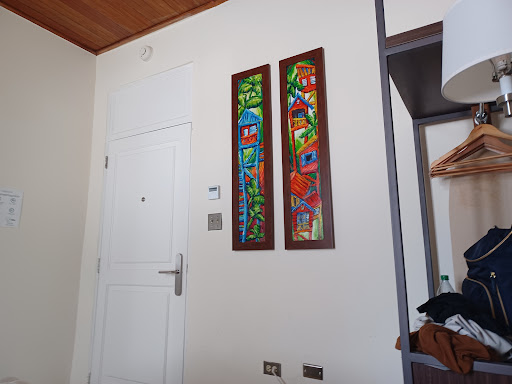 • Amenities: Ceiling fan, one luggage rack, hair dryer, a few hangers, iron & mini fridge. • Bath: The shower takes 3-5 minutes for water to heat up (on our last morning there my husband got no hot water); pressure is light. We were provided with 2 bath towels, 1 washcloth & 1 hand towel; however, there was no handsoap by the sink (there is hand & body soap in the shower). Also, there's only a couple inches of counter space to lay your toiletries. I ended up putting mine on the floor or on top of the closed toilet lid. I'd highly recommend adding a small shelf to the bathroom or at least a small vanity mirror to the desk area for getting ready. • Bed: Comfortable bed.. soft-medium firmness. Pillows were firm. • Cleanliness: Excellent. Housecleaning not requested during our stay. • Cooling: Room stayed remarkably cool! • Decor: Lovely. I especially liked the art. • Sound: Quiet at night but fairly noisy in the morning starting around 7:00 AM. • Terrace: We didn't use the balcony other than to dry our clothes/shoes after going to the beach. • TV: No regular channels; however, Netflix is set-up & ready to stream. • WiFi: Worked well enough • Other: Door locks when shut; however, there is no deadbolt or chain lock inside the room. In addition, light from the hallway floods the room around the loose door seal. Tip: Bring a bag for trash; there is only one very small bin in the bathroom.