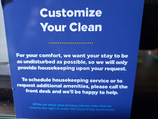 2] Consistent, persistent cleaning disruptions: As I was on bedrest, I was pleased to see that the hotel's policy on cleaning was "Customize Your Clean [...] we will only provide housekeeping services upon your request." We placed a Do Not Disturb card on our door. Every day, at least once per day, we both were called and/or had our room visited by the cleaning crew. Most times we were awakened by the knocking and calling, and we would be asked what time we were checking out. It seems there may be a communication issue between reservations and guest services/housekeeping? It wasn't horrible to be so attentively asked if we wanted our room cleaned, but it was frustrating on the last day especially when we received a knock at 9am, 10:30am, 11:30am, and 11:45am and were asked when we would be checking out. We told them noon each time.