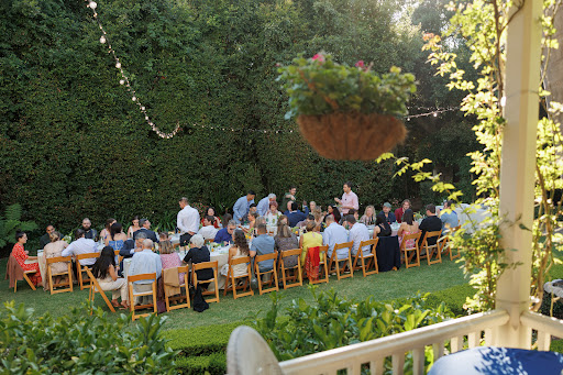 On Friday, the Simpson House team hosted the rehearsal dinner for the couple. The food was spectacular, and the atmosphere couldn't have been more beautiful. Lighting at this venue gives you that perfect golden hour glow which is just stunning for pictures. As the sun set, guests gathered on the lawn to enjoy an outdoor movie night complete with snacks underneath the twinkle lights.