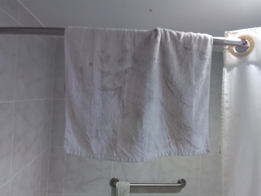 Towels are stained. Pillows are empty-ish and lumpy instead of quality pillows (large soft, melting firm, forming). Lighting is bright white, instead of soft cozy (yellow). No guest laundry room. No lamps. No black out curtains, so 'hello sunshine' when trying to sleep during morning/day. No door latch lock; therefore people can open it all the way, and enter. No clock radio.
