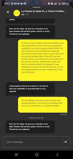 Problem #4 (MEMBERS READ THIS) - We were taken to the same type of room we had booked. NOW, I want to be very clear that we do not at all feel entitled to an upgrade. This is a customer service issue. After we ate and shook of the road buzz we decided to send them just a feedback message via the app. I have attached a screenshot of the conversation.