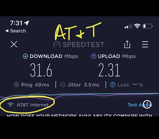 AT&T - download 31.6 mbps, upload 2.31 mbps