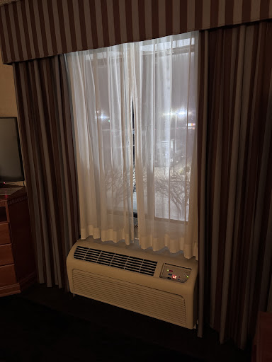 The parking is strictly in front of the building, so if your room is in the back, you will not have a view of your vehicle. Now....for the room...oh my how gross it was and I will start with the weird and not pleasant smell. From the 1980s decor, with circus tent curtains that did not fully close (see picture), to the peeling wallpaper and buildup of filth it was downright disgusting! There was a weird splash of something that had been painted over, so it made me think of a covered up crime scene. The refrigerator was warm, not cold. There was a large tear and filth on the bench at the end of the bed. There was build up of crud in the corners, especially the bathroom and what was obviously dried pee around the toilet. The shower has apartment style doors with crud build up in the corners and a pinkish color of mildew in front. The door security lock did NOT work (see video)! The door deadbolt (?) didn't feel like it latched. To top it off, this hotel was the most expensive out of all the Hampton Inns in a five day trip! If you want to be ripped off, stay here. If you want to worry about security, stay here! If I had not been exhausted, I would have left, it...