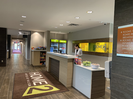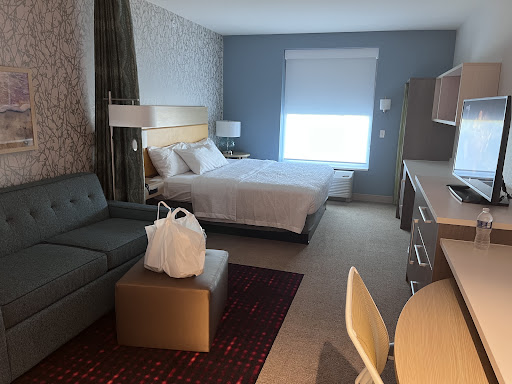 Read moreThis Home 2 Suites is located at the far end of a shopping plaza and has a large lake and park about a tenth of a mile from the entrance. The hotel offers free bike rentals for you to enjoy the park which is nice. ||First impressions send out higher end boutique beach hotel. For the price this place is amazing! Many guest were checking-in for a month or longer stay. ||The lobby is open and well decorated with a separate and equally open space for free breakfast and daily snack hour. The hotel gives you a pamphlet when you arrive to tell you of their wonderful amenities and times of availability as well as all the things offered nearby. Free yoga anyone? ||The suite was open with a nice kitchen including two burner stove, full size fridge, dishwasher and microwave. Seating area had a nice chair and comfy sofa. The bedroom was separated by an actual door and offered a desk and very comfortable beds with multiple plush pillows. The sink and counter area of the bathroom is separate from the shower and toilet, great for two or more people getting ready together. Nice closet with many wooden hangers and a safe. Overall great first impressions of cleanliness and the room smelled fresh. ||This is where the almost perfect comes into play. Later in our stay we noticed two things. One, the carpet wasn’t as clean as it appeared; leaving our feet black if we did not wear slippers. Two, you must get up with the sunrise. Even though the window treatments gave a clean beach vibe and the windows were privacy tented, they were far from light blocking. Not good for someone who likes to sleep in late. ||The laundry, gym and pool area were all exceptionally furnished! The laundry had nice high end appliances for 2 dollars a load. The gym offered Peloton products as well as other equipment. There is even a small basketball court. The pool however is the crowning glory. Located outdoors it was nicely sized and offered covered cabanas and group seating with very nice grills. ||Plan on staying here again for my next visit to the area. Great overall experience, just need to bring...