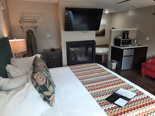 Again, no rugs in the main bedroom (bath tubs are actually IN the bedroom) and faux fireplace in fact does not even include faux wood but is rather plastic crystals with a tech image of flames.