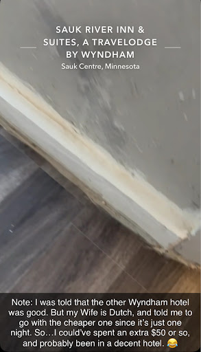 My friend recommended the AmericInn, but this was also a Wyndham hotel, had a pool, and was about $50 less, so I went with it. This was not a wise decision. The pool was “under maintenance,” which should have been removed from the website if it isn’t useable at this time. I caught a peek, and there was water in it, but also a bicycle on the pool deck, so I’m not sure what was going on there, but my son didn’t get to swim, which was a very big disappointment. The room was in rough shape. The flooring was very poorly installed (cut jagged and short of the appropriate size), noisy in places where it was “floating” a little too much, with a jagged bump in the bathroom; almost like a screw was under it. Caulk was smeared along the tub, baseboards in the main room, and walls. Just an astonishing amount of caulk seemed to be everywhere. The door frame had a sharp chunk fall out of it in the morning; I have no idea how, as even door slamming (which we did not partake in that; though it seemed that lots of folks enjoyed it at 2:27 in the morning) should not cause such a thing. We came back from looking at the “continental breakfast” and it was just laying there. I didn’t look too closely because we were about to leave, but there was probably caulk failure involved. The coffee table looked like it had pink and green nail polish or spray paint in huge splotches on it that someone tried to remove with acetone as well as scratch off, destroying the table top in the process. The floors were dirty, with a film that required no bare feet EVER. Under the bed (which was very visible between the huge wooden sleigh bed frame and the actual platform holding the mattress itself) was full of crumbs, loose change, and what I would estimate to be months of dust/dandruff. The heat/ac unit smelled strange, and the buttons on it were completely worn through. Tiles around the jacuzzi were cracked. The towels were in poor shape; very frayed on the edges. The bathroom had a single roll of toilet paper in it that was almost out. It took about 20 minutes for us to get enough toilet paper for me to be able to use the bathroom before bed. We went to a gas station to pick up breakfast, because the food available was...not appealing. I will say, the gal at the front desk was very friendly, which was a positive. Also, the bedding was reasonably clean. I would advise to spend the extra money on the AmericInn across the street. The giant mirror across from the bed makes me think this is the kind of hotel you would want to go to for…adult activities. It wasn’t a family-friendly...