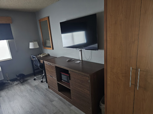 EXCELLENT motel and reasonably priced. I am a Wyndham Rewards member, so well worth signing up to get deals on their rooms.||When you walk in the door, a semi-southwestern decor greets you with a wood staircase to the right and up to the 2nd floor. (No elevator). ||The front desk is would be in front of you and the pool to the immediate let. The breafast room is to the right of the front desk and in the hallway is ice machine and vending machines. All nicely located.||It is an all NON-SMOKING motel. It smelled fresh and clean, especially for a pet-friendly motel to boot!||We travel with 2 pets and requested 1st floor near an exit so that its easy to walk the dogs an all hours. They delivered.||Plenty of parking. Carts for bringing in luggage. Easy, plesant check in. The front desk was ready with our reservation.||We reserved a double queen room, pet friendly. VERY nicely appointed with hard surface floors (wood look). Microwave and mini-frig. Desk with adjustable OFFICE CHAIR and lamp that featured plug ins PLUS 2 USB ports. Nice touch as I work remotely and always have phones, laptop and tablet with me.||VERY HIGH SPEED INTERNET ! I was impressed. At all hours. WONDRFUL.||Coffee pot in room, included condiments, coffee, coffee cups + plastic cups. Dove brand soaps and shampoos.|| Beds were super comfy and so were the pillows. I also liked the window treatments. Instead of the usual curtains, there was 2 types of roll up shades, 1 to filter light and 1 to darken the room.||Overall lighting was good. Sink, bathroom, desk and bed stand. Bed stand also had electric outlet in the light for charging phones, etc. Big flat screen TV with lots of stations. Clothes iron in the armoire.||Two nice touches: Note pad with pen and a DIRECTORY. Listed everyting about the motel, all the TV stations, times for pool, and local eateries.||Also has a guest laundry with supplies and change available at...
