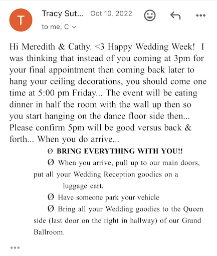 We hurriedly finished decorating by about 9pm. My husband and I had plans to have our “bachelor” and “bachelorette” parties that evening—time to spend with our wedding party family and friends who we missed at our Covid wedding and hadn’t seen in a long time—but these plans were cut short (and in some aspects, ruined) due to the double-booking. I know the night before the wedding event is not when bachelor(ette) parties typically are, but what if we had plans for a rehearsal dinner, as is typically done the evening before the wedding? Neither of those plans would have been possible because of the schedule change and double-booking of the ballroom.