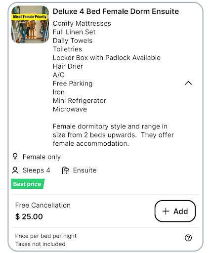 I paid the extra amount for a Female preferred room. When I checked in I went to my room of 8 bunkbeds, and 4 men inside. I went back to the front desk to inquire about the other beds, and they explained that there was 3 more Male names set to check in between then and 2am, and that they could not move me since they were full that night. I asked what was the point of booking female preferred if I was the only female and I even saw other women walking around so why was I not with them. 1 girl out of 8 is very unsafe. I understand the hostels are shared spaces but the front desk was very unhelpful. They said I should book a hotel room. (the hostel is Inside a Hotel)