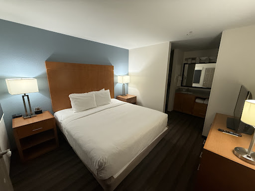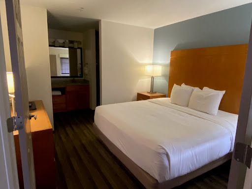 The rooms were spacious, clean and nicely decorated. I really liked having the main bathroom separate from the sink area, and the walk-in closet was a nice bonus. It was a great place to work, too. Nice desk, comfortable couch with a side table that slides over it. Plus you're within a few miles of some fun bars and restaurants. There is also a cigar bar around the corner which is a favorite of mine.
