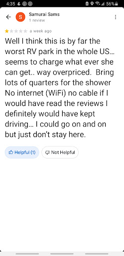 Read moreProbably the rudest woman I have spoke to in a long time. I am always in a great mood and upbeat. I tried to make small talk, this woman was just rude. I have a small 16’ foot basecamp airstream. She yells at me “how am I suppose to know what that is?” I said I just told mam, it’s a 16’ trailer. She replies back 17’ . I said no 16’ . Now she says “im not going to argue with you over 1 foot” I was on the phone in shock. Like what did I miss? Is she joking. I should have hung up but didn’t . Now she’s asking me what am I pulling it with? I say a truck. She persists to know the length of my truck. Follows up with per question which we don’t have any but I got the feeling she thought I was lying with her long pause . Than tells me it’s $75 dollars a night and lists things that are broke and not working in clouding some showers and internet. I told her she needs to work on her phone skills and how to be polite to customers. If it’ was fee I wouldn’t stay here. Imagine having to deal with this woman ….. seriously if she behaves like this on...