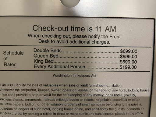 As always, I will start with the only bright spot at this entire property. That would be the bartender in the Bistro, Kathleen. She went above and beyond to ensure all of the failures she could mitigate (which weren't many) would be handled. As a new transplant to Seattle from the Denver area, she is going to do well in our neck o' the woods. Thank you, Kathleen - this would have been a one-star review without you! And now, the reasons for the two-star rating.