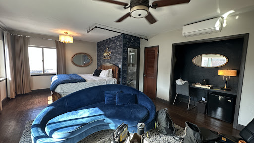 My partner and I stayed in room 3, an interior queen. It was so huge. Way bigger than any other room in the area for the price. The bed was extremely comfortable. Our room had art from a local artist and a giant round chaise lounge. The bathroom was really nice and came with good shampoo and conditioner and heated floors. I tried to run all the hot water out but it never ended. Good water pressure with a big overhead shower head and one that comes off the wall. It also had a desk area and fast wifi that came in handy working on the show.