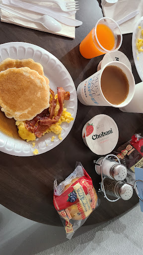 The breakfast choices were a variety of hot and cold options. However the hot options included a pancake machine that I have never seen before. You press a button and a pancake is made. It's the worst tasting pancake ever and is very rubbery in texture. The egg and cheese tasted very bad as well. All the hot options are frozen types of food that is heated. I would strongly recommend either only offering cereal and fruit or upgrade the hot options to offer real scrambled eggs, sausage and bacon.
