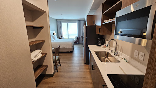 Cons: -Although brand new, our room (#320) still had a few issues including; the sink garbage disposal was inoperative and the bathroom vent fan didn't respond to the wall switch, so it was on constantly -The blackout curtains didn't do the best job of keeping the morning light out -Each room has a mini-split ductless AC/Heater unit high up on the wall that works great, but we had to cover the temp display at night because it was so bright. We had to do the same thing with the microwave display -The dishwasher in the room is VERY loud, so I'd recommend only turning it on right before you leave -The lobby breakfast area is super small, so be prepared to take your food back to your room -Just one elevator, so be prepared to use the stairs