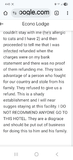 The shower water was warm. The staff was very kind prices were high for what the rate on Google maps said also things that I noticed it says that there’s breakfast and it’s free but today when asked, they said you don’t offer free food but it’s a part of your amenities, so all the visit was pleasant but unpleasant that you say there is breakfast And then you don’t serve the breakfast so that’s the only real reason. I got a room here last night because I’m driving from Quebec to Florida and I wanted to eat free breakfast at a hotel. It said you guys had it but upon trying to find it this morning you guys told me you don’t have that so I would just suggest you guys and when I say you guys, I mean really the owner or general manager whoever it is that looks at the reviews. I suggest you take it off of your advertisements because that’s false advertising saying hey we do breakfastand then not do breakfast or even still if you guys do breakfast but this morning whoever you have working there didn’t wanna set up breakfast you know you just need to take it off because there’s no free breakfast there and that’s really a downer. also I was there from 12 AM till 10:45 AM and it says $43 a day you guys tried to charge me $158 and I wasn’t even here for a full 12 hours. I would have given five stars but because you don’t serve breakfast and even if you say oh I’m sorry, sir we serve breakfast but still doesn’t fix like a you didn’t serve breakfast today so false advertising on free breakfast and trying to charge me $115 more for a fee and rate that is $43 is absurd. I would’ve given you all five stars but because of these three things I have to give you two star rating the rooms were a three. The service was a three only because someone asked Hey is everything good do you need anything? So the service was a three and the location is a four but all in all because of the false advertising of free breakfast you...