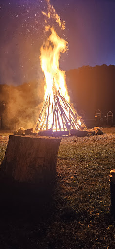 The office building contains a large laundry room with change machine, a small lounge area with a pool table where they stack delivered packages, and a camp store with some convenience store items and souvenirs. The bathhouse on the east hill contains both bathroom and shower stalls. Next to the bathhouse is a large pavilion with several picnic tables and a large grill. Walking down the hill past that pavilion brings you to the communal fire pit area, then the pool area, and the playground. There is also a new jump pad (installed during our stay) and basketball hoop in that same area. On the east side of the lake is a short dock, an equipment shed, and two boats available to rent (a metal canoe and a rowboat).