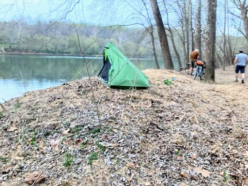 Not one of the best campsites on the C&O. Most of the ground is dirt which would turn to mud with a little rain. Most of the spots flat enough for a tent are on lower ground and probably prone to having water run thru them in a heavy or prolonged rain. There is one good spot on a berm right at the edge of the river bank. It has some grass on it, very soft dirt and slopes away on all sides which will drain runoff well, even in a heavy rain. The photo is my tarp tent pitched...