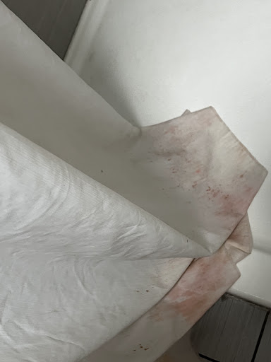 The mattress had a HUGE blood stain on it like someone was killed or seriously hurt there. It was on the corner/side of the mattress making it unlikely to be menstrual blood or a serious nose bleed. The mattress was so firm that we both woke up stiff and sore. The bed frame is a metal contraption that sticks out to stub your toe/able/knee on. The bed frame is so loud and squeaky that it scared me whenever my husband would...