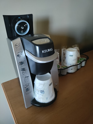 The breakfast room coffee was the standard weak brew. But the hotel provides a Keurig coffee machine and coffee pods, which is always a welcome touch. Why more places don't do that, I'll never understand. And it's really the only place these waste-generating little machines seem appropriate anyhow.