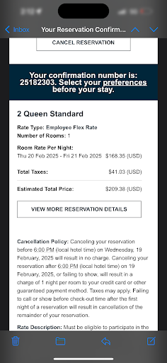 Read moreI booked a reservation for 2/20-21/2025 for a Standard Double Queen.. using Employee Flex Rate because you all did not have an employee rate available nor a points night stay. So I booked the flex rate..