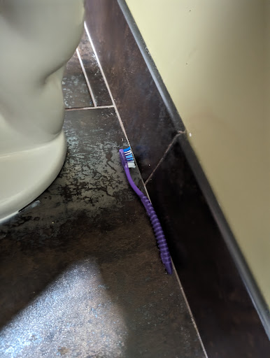Damaged Amenities: The shower floor and sink were both scuffed and worn, contributing to an overall sense of neglect. Also there's a random spot of brown on the wall by the toilet that looks absolutely disgusting! If OSHA came through they would have a field day