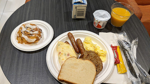 Breakfast included hot items such as thin pancakes, sausage patties, and scrambled eggs, plus cold items such as breads, yogurt, etc. The pancakes and eggs were very bland, even with syrup, salt, and pepper. We appreciated the variety of other items. There's a Cracker Barrel in front of the hotel (5-minute walk) if you're wanting more.