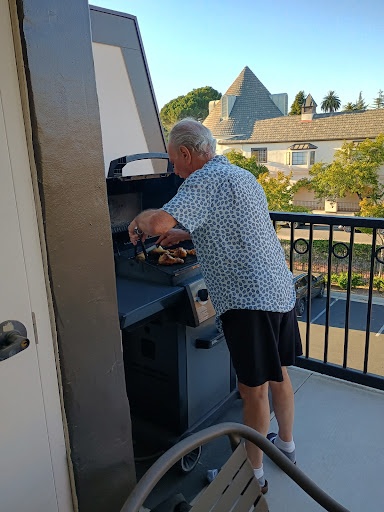 The living/sitting/dining area was a bit tight--couldn't be an 'accessible' unit after all! ;-) There was a fireplace that we didn't need to use, but we used the DVD player and watched movies a couple times. We enjoyed having our own BBQ grill right on our patio, with table and 4 chairs. Our view looked over the parking lot to the building next door, but it was a good distance away and there were trees, too, and good separation from neighboring units.