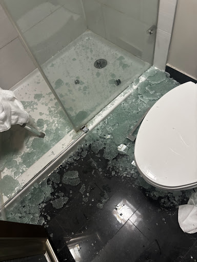 Later that day, after resting from our travel, I attempted to shower. As I closed the glass shower door, it came off its hinges. My partner came to assist me, and the glass door shattered completely—striking him on the head and covering the shower and bathroom floor with broken glass. I sustained cuts to my shoulder, and down the right side of my body where I am still removing glass shards and he received several glass pieces in his feet as he attempting to move through the debris to call the front desk for help.