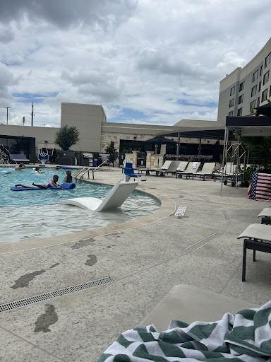 The pool gets full sun âď¸ exposure, bring sunscreen & hat! Sadly, we got rained out around 4 on Friday. BUT we came up to our beautiful hotel room which has a wonderful shower, WITH softener in the water , so refreshing. Then had dinner nearby. You can actually walk to a few restaurants, the bridge over the highway has a spacious walking pathway most of the way.