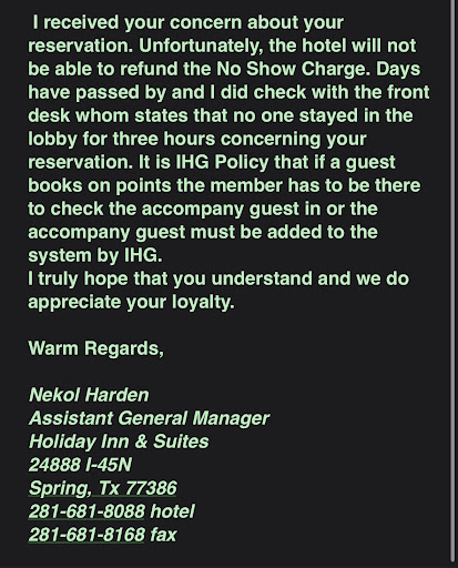 Let me start by saying I’m a HUGE Holiday Inn fan. In fact, I’m staying at one right now. I beg you to not patronize this particular location due to the horrendous customer service and management’s response to the situation.|Last week I booked a last-minute trip to meet up with my friend that has stage four cancer. Unfortunately, my flight got delayed, so I called the hotel to add her name on which would allow her to check in without me. Apparently, if the front desk doesn’t answer, your call gets rerouted to the national hotline. I hung up and tried calling back, only to be redirected again. I explained to the gentleman I was trying to add my friend’s name to the reservation so and he said because it was for that night I would have to contact the hotel directly. I told him I had tried but that’s how I got routed to him. |He offered to call the hotel for me and put me on hold. When he came back, he said the hotel’s system was down and they would not be able to add the name to the reservation. I asked if they could make a manual note so she could check in. He again put me on hold but the hotel denied the request. |I explained to him that she was very ill and needed to get into a room as soon as possible to be comfortable. I also explained for health purposes she could not just wait in the lobby for three hours until I arrived. He again put me on hold but they told him that it was hotel policy that I would need to be there. I then asked him if the hotel was sold out to which he responded to with, “no.” I suggested that they hold her credit card, but not charge it in case I for some reason didn’t show up. Then they could keep my points and also charge her for the room. They would clearly be able to see how sick she was upon arrival and understand why she couldn’t just hang out and wait. I was told no. So I told him I was going to need to go cancel the reservation. He apologized profusely, but said less than 24 hours before he would not be able to do it and gave me a different number. |My flight was about to takeoff so I told my friend to just find a different hotel to book. The next day I called and explained my situation. The representative was very apologetic and said there was nothing that she would be able to do since the reservation passed. I asked to speak with a supervisor. Magically, while being transferred, I was disconnected. I called back and spoke to someone else, explained the situation again, but again was disconnected. The third time I called, I immediately asked the agent if she could have a supervisor call me so we didn’t get disconnected again. Whoever called me back assured me that the points (like I said, I frequently, almost exclusively, stay at Holiday Inns) had been refunded to my account.|A day later, I noticed that my credit card had been charged $129. When I inquired why, I was told this was a no-show fee. She said that the no show fee was because I tried to cancel within the 24 hours of the reservation, even though I had booked the reservation a couple hours before all this happened. She opened a claim for me and said someone would get back to me shortly. A day or two later, I received the attached response. |I emailed back and I asked that because of the circumstances I felt like this shouldn’t fall under hotel policy but should be considered on an individual basis. In a separate email explained she had gotten inaccurate information and the reason days had passed (as she said), was because I had been told that the points had been refunded. I was never told about the no-show fee. I told her that I had offered multiple solutions but they were all rejected. Now remember, my request couldn’t be accomplished because their “systems are down.” I said how disappointed I was in the whole experience and expected better from a company that I’ve always spoke so highly about. I never received a response to either email. |Today I noticed a different email on my confirmation and decided to try one more time. I received a response from the same manager, which I have attached, as well.|If I can save one person one person from going through the awful experience I did, this will have been worth my time. Please give your business to another location. |Edit|Just figured out why they charge a no show fee instead of keeping the points. So you can’t write a review on their website....