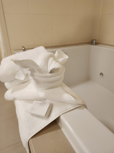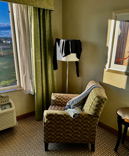 Read moreWon't return. Instead of a comfortable, cozy room it was stark and way too modern. A single small drawer in the room - otherwise there were two shelves starting at the floor and ending two feet up (above was the fridge, TV etc) which meant that only first few inches were reachable without having to get on the floor on all fours - they were virtually useless. There was plenty of room for a full size dresser but, alas, sacrificed for fashion I suppose. Even the bedside table was without drawers OR shelves - just like a shelf. The beds were the worst. Comfortable ONCE YOU GOT ON THEM. They were incredibly high. I am 5'5" and literally had to jump to get on the bed. My son is 6'1" and his feet dangled when he sat on his. Woebetide any short people who try to sleep here - you will literally have to stack up your suitcases to create steps. Decor was nonexistant, although I think they THOUGHT it was accomplished. Three small pictures on one wall in a neat row. Laminate flooring with a carpet between the beds. Flesh-colored walls and some odd colored curtains. No color coordination. Indeed, colors ranged from pastel to very bold. What a mish-mash. I hope they didn't pay somebody for that. Very cold feeling room. I'd expect, it being a Hilton property and higher priced that neighbors, there would be real glasses not plastic wrapped plastic cups that will be headed to the landfill. Staff was cold and disinterested. No free breakfast offered but you could but into the buffet if you want. Nope, not want. They need to be reminded they are not a destination hotel but rather a stop over on the way to somewhere else. Guests arrive after a long drive and just want a comfortable, familiar room to rest up for the next day's journey. Really missing the mark...