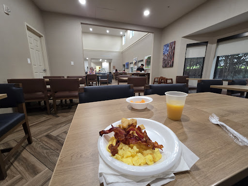 At Check-in, the front desk person cheerfully and courteously greeted me as a rewards member and the rooms were side by side 201 and 203. She also made sure we had bedding for the pull out couches. I appreciated her forethought. Although the carts had leftover pet hair on them, I used 1 of 2 luggage carts to unload my van. This is definitely a back saver. The hotel has two elevators that arrived quickly each time. The hallways are well lit and there is a long section of windows so you can overlook the breakfast area and it also add lights to the hallway. I found our rooms clean and odor free. When we needed extra towels, the front desk politely provided them. When we needed additional ice for our coolers, the staff loaded us up too. They went the second mile. All appliances (fridge, dishwasher, stove top, microwave, and toaster) seemed to be working properly. We used the stove top to fry up chicken for one meal and steak for another. We used the cutting board to chop lettuce and the pots to make broccoli and Alfredo sauce. We used the microwave to make popcorn. I appreciated the deep sink in the kitchenette along with the disposal. We found the fridge spacious. For the bathroom, I appreciated the bright lights and deep sink there. There was also plenty of space to store your toiletries on the bathroom counter tops. However, I wish the bathroom had a fan to help with shower steam and also for when people used the toilet. My wife would have like a hair dryer. This is the one time she didn't bring one. There was an iron, iron board, safe, and extra pillows in the bathroom closet. The king size bed slept well, and the kids slept like rocks on the pullout couch. When leaving, I had no trouble making a left or right on to Route 1.