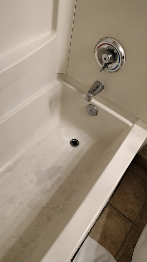 Read moreThere were cops in the parking lot when we got there. I was too tired to leave to drive safely and had already paid online. The young man at the front desk was really kind, reassuring, and helpful. I had to ask him for some sheets for the pull out bed and bill exchanges for the vending machines, and he was very helpful and patient about it. He's the reason for any stars at all. I was hesitant to make a review, but I think it could legitimately be a health hazard. The stairs were covered in filthy thin worn down carpet, and the door was patched up. The keycard was nice, so I thought it would be okay inside. From the first glance it seemed to be with updated decor, but it was not. The floor was sticky and dirty. Shoes stayed on. There was an obvious dried up spill on the floor of some sort of sugary beverage. There were crumbs, pieces of food, and some baby socks under the foldaway bed. The middle of the peel-and-stick laminate flooring was worn through and chipping, and a piece stabbed my son's foot when he stepped where the subfloor was flexible. There was a greasy handprint on the table like it was slathered in something. The mini fridge was warm, damaged, and the seal was broken and unusable. The TV was nice. There was a 7 inch wide round bloodstain in the mattress up where somebody's face would be. The bedding seemed clean. I didn't see any bugs or anything under the mattress pads, so we just stayed. The bathroom sink was held together with random caulking and a prayer. The bath tub was painted over a LOT and had wear marks through several uneven and oddly colored layers of paint. The faucet sprayed outward in a cone shaped mist that will spray anything on the sides of the sink. The toilet wasn't awful. Just low flow and have to hold it down to flush, so normal. There were pieces of thick wooden laminate flooring like an inch thick and about two feet across screwed into the floor just outside the bathroom tub. We chose not to turn the shower on or use the tub. There has clearly been water damage or something to the subfloor in the bathroom and inside the room. The floor is soft and flexible, and I worry about mold exposure. The beds were comfortable. The AC unit was very dusty and caked up. The smoke and monoxide censor on the ceiling looked greasy. They need a contractor in there. I kinda wish I went camping, but it was fine and now we have a story about why you should make sure that you know what you're doing with home repairs...