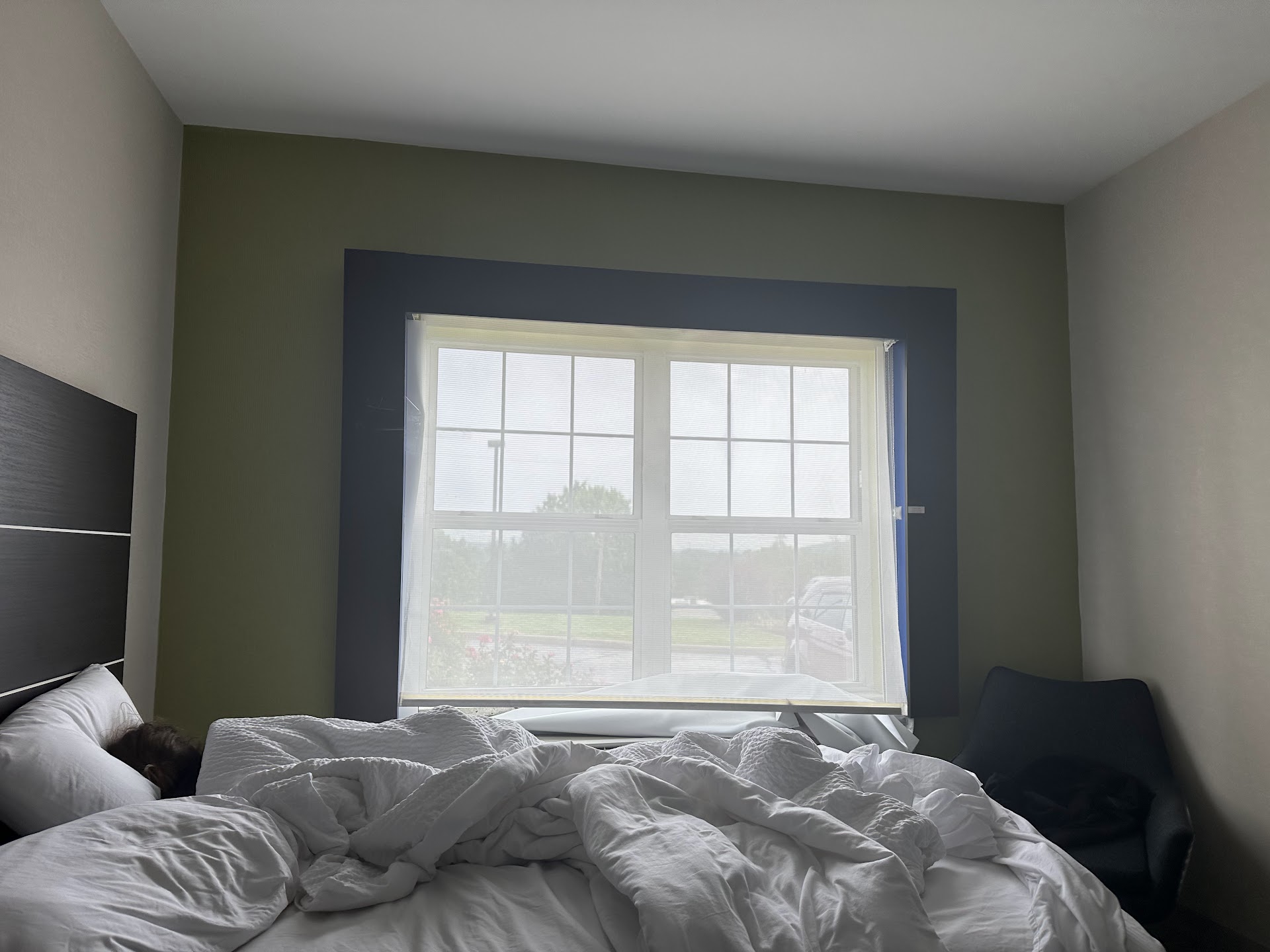 The real fun started at 3 AM, as I woke to a bright light in my face which was coming from the parking lot (our room faced the front entrance, 1st floor - room 128). The room darkening shade had pulled away in the left upper corner, so I moved to the bottom half of the bed to try to stay out of the light. By 5 AM half of the shade had pulled out, basking the room in light. I went out to the desk, and tried to troubleshoot how to be able to secure it so that I could sleep- the front desk gave me packing tape to try to secure it. The receptionist made sure to let me know I had to return it right away. So, while working around my two sleeping children and husband, I tried to tape it to the wall and the other window shade. By 6 the whole shade had fallen off. Sleep was not happening, and additionally there was no privacy, as anyone walking by could just look right into the room (pics).