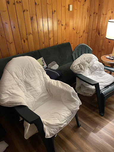 Let me go back to why the lawn chairs were in our room… This specific room was booked so we could enjoy the amenities of having an actual “living room” when we wanted to just relax. The couch was as stiff as a board and there was no position in which you could get comfortable. We finally decided to bring the porch chairs in to have some level of “comfort”.