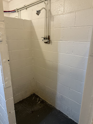 The showers do need a make over, but bathrooms are expensive to update so we couldn't really complain. I, myself, am just always glad to have running water and working toilets and showers available. My suggestion would be to add a wall box to each shower so that guests can store their belongings up off the floor. The floors in the showers can puddle quickly so a shower squeegee with a long pole placed in each one may be a cheap and easily purchased help. This way guests can move the water to the drain. Also, I wonder if different shower heads could be installed that spray the water directly downwards onto the floor instead of out into the back of the shower like they do now. That may help to keep the water more towards the drain side.