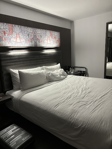 The hotel has an overall modern décor. I feel mostly tailored to the business traveler. As someone who frequently has to travel for work, I know what I need in a room to complete my work. The room layout is modern and spacious but it did lack storage space. There is no shelf in the closet where we could put our bags away so we had to leave it to the side of the closet which did make it feel cluttered. Only 2 small drawers in the room - not a big deal for a business traveler but since this was a leisure stay, we ended up using the chairs and the side tables to put our stuff on. Our room was facing the street with a floor to ceiling window and blackout shades. It brought in a lot of sunlight. It was actually really hot when I first entered the room since the shades were open and it took awhile for the AC to cool the room. We left to dinner after checking in since it was too hot to stay in there. For the remaining days, we only opened the shades (half way) early in the morning or late at night but made sure to close it before leaving for day so the room could stay cool. Also, if we opened up the shades all the way then everyone would have been able to see inside of our room from the street. The noise from the street was not bad. There was some loud music coming from Murphy street (most likely the bars across the street) on Thursday and Friday night. It didn't prevent us from sleeping since the music did not go on all night.