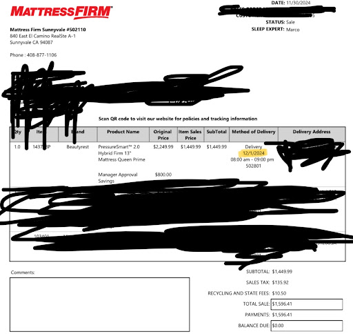 I bought a mattress from this store on Sunday after 2024 Black Friday. The salesman, Marco, convinced me to buy a beauty rest pressuresmart 2.0 firm hybrid queen mattress with a manager approval promotional price $1449, guaranteed me this is the best price I can find. The delivery is scheduled next day. Everything turn down so quickly. First is that they send me a defective mattress with a huge hole on the back. I didn’t accept it. They deliver another one two days after and offer $100 compensation to compensate my loss, time, expectation, etc. I was frustrated with their quality check. There is no excuse to send an obviously defective product to your customer and expect them to accept it. If I didn’t find the hole when the deliver crews still there, I doubt that they will take it back and send a new one.