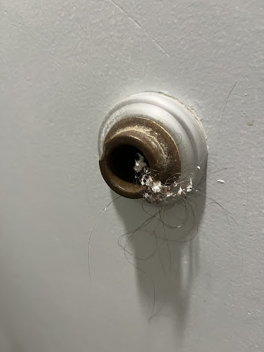 The ceiling had substantial crack in the middle with delaminating paint and the air conditioning unit had massive exposed insulation around it. The mildew on ALL the joints where any two angles met was caked heavily with black mold and the shower also had wide spread pink mold. Donât sit down on the toilet, the seat is coming apart and it may cut you! The tub floor had permanent black-something all over it and I really wish Iâd brought shower shoes. The shower curtain reeked of mildew and the towels were crusty and smelled of old smoke. In the ceiling of the shower was mold and long strands of human hair.