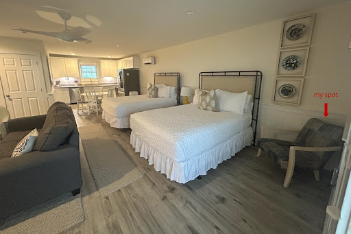 One concern we had was hauling our luggage up three flights of stairs. That was assuaged by an elevator at the rear corner of Saltwater Suites. It was a slow ride, taking almost 30 seconds to get to the third floor. The suite (#303) was impressive, most particularly so to Wife. It had immaculate dĂ©cor, vinyl wood flooring, a washer & dryer set that looked brand new, a pristine bathroom and an equally pristine kitchenette. The A/C unit came with a remote and instructions on how to use. It took a while to figure out how to set it to Eco mode because the air was strong and cold. The pillows came in different levels of fluffiness â my preference was thick. Sleep was not difficult at all on both nights. There was an armchair by the wall next to the queen bed â I made that my spot.