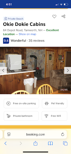 Read moreI get two weeks off per year, and the owners of Okie Dokey Cabins ruined my âvacationâ to New Hampshire. They then charged me $1,300. I paid for two weeks to stay at this place. I checked in at 6:00pm and within two hours I became nauseated because they use a compost toilet in the cabin which causes the cabin to stink like a heavily-use outhouse; the longer you are in it, the more the stench saturates your nostrils, bedding and clothes. As it was dark outside, and I had nowhere else to go, I attempted to get through the night. I was awake all night, and feeling a lot of stress. It was pitch black outside. The stench inside was overwhelming. Along with my nauseated stomach, I developed a throbbing headache. I paced the cabin, just waiting for daylight, so that I could evacuate. At 3:30am, my heart went into atrial fibrillation. I took extra doses of medication, and was forced to lay on the plastic mattress. The foul odor in the cabin was overwhelming. When the sky lightened, I managed to put my belongings into the trunk of my car, and left to go to a hospital. I called the owners that morning and told them what had happened; that I was unable to stay in the cabin another minute due to the horrible smell, and that I was suffering from a heart problem (likely triggered due to the stress of the night). They did not care. They refused any refund. They charged me for TWO weeks. I challenged the charge, but the owners provided a copy of my signature to my credit card company, and received my...