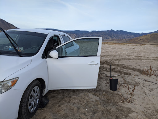 I tried out some dispersed camping here at Hanning Flat and I was driving towards the lake and my car got stuck in sand. It was a dumb mistake but I learned my lesson. Luckily, I was able to make phone calls and use internet on my phone from here. I called for help and got out. Just a warning for any off-road newbies out there. Pay attention and don't drive towards the lake unless you know for sure your vehicle can handle sand and make sure you have a shovel and a tire traction device with you in case you still get stuck. Here'a photo of my car in the sand and a pin drop to show the location where...