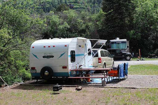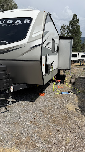 Read moreGreat check-in staff. We were given a buddy site when we checked in which was much too narrow and in the full sun. Told the ladies we could not open our rooms nor our awning and asked for another site. Since we were staying a week they had no problem putting us in a much better site with shady pine trees. All the staff but one were friendly and helpful. One older man stopped and gave me a ride to the laundry when he saw me carrying my laundry bag! Very nice! Just one staff member was rude and obnoxious. Some older guy who worked there and thought he owned the place yelled at us (he had Montana plates). We tried to walk out of our trailer with our two dogs and some woman had a dog with a leash on but no one was holding it. The dog was running around loose and some other folks were trying to walk their dogs as well and the dogs all started barking at each other. The woman finally took hold of her loose dog and we continued walking down the row when this guy screamed at us out his window of his fifth wheel as we walked by. Didn't let him ruin our vacation but he needs to retire and go home. This park is in a beautiful setting with mature trees on many sites and a creek running through it. Sadly, it is good to stay Sunday and Monday but too full later in the week and weekends are a nightmare. Chaotic, noisy, and impossible to get any peace and quiet. Motorcycles, off road vehicles, kids on bikes, people with loose dogs or dogs tied up outside their rigs with no one watching them were a pain. Tried the restaurant on a Saturday night and the food was not good. My husband was served a raw hamburger and had to send it back. Couldn't figure out why so few people were there but understood after trying the food. Had a buffalo chicken sandwich which was so hot and spicy it was inedible and after waiting another 40 minutes we asked for a refund on the hamburger and left hungry. Tried the ladies shower one afternoon. Tiny showers that were dark inside when the shower curtain was closed. Hair band, hair, used band-aid, and dirt were on the floor of the dressing area. Did have decent water pressure. Dog park was clean with fresh cedar chips but located a long walk away at the back section of the park. Had a couple people ask us if we knew where it was as they hadn't been able to find it. Never saw anyone using it except employees. Most sites are roomy enough but not being cleaned very well. We picked up all kinds of plastic bits and pieces, bottle caps, tissues, etc in our site and noticed other areas of the park e.g. in front of cabins had small bits of trash as well. This campground needs much more attention paid to cleaning and maintenance. There are jeep rentals on the site and a small store with supplies. Kids have a playground and bouncing blowup toy. We loved the location of this park and the mature landscape but will look for a cleaner, smaller, quieter...