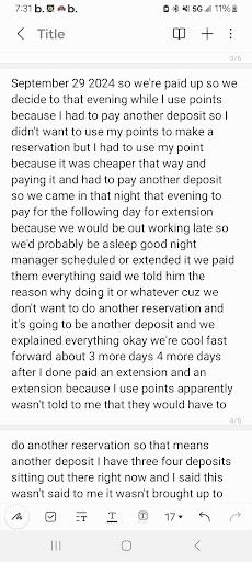 Now to Sept 27 2024 just like any other day I go into extend cause that's what I was told to do do not schedule anything on the internet don't make any reservations and don't come in in the evening come in the morning and extend your reservation. So tell me it is booked completely so I'll go online I see they still have available to end up booking another reservation for that day and it was more it was like 30 $40 more for the room because if I scheduled a larger room. I then asked if I can keep the same room that we're in cuz all of our stuff is in there they said no because I purchased a different room I said well can you offer the room to a to the customer for since it's already paid the difference. Manager comes in with a list of five names on it she told the front desk clerk that he can have his room if one of these five people don't update their account for extending guess what my name was on that list the people that were there for what they consider long-term they asked him if they're going to extend they give them a chance to extend they failed to tell me this plus they knew it so they had me do another reservation which got them more money and another deposit out of me I said my name's on that list they said well you already have a reservation and you're unable to cancel it preserve rules of canceling reservations that close again I said you know what I'm not arguing it's whatever