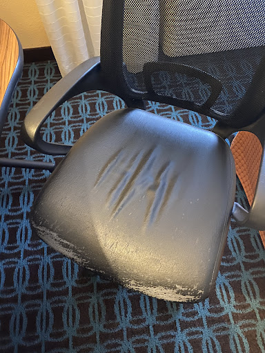 On the 23rd, the bathroom floor was dirty, the faux leather on the office chair was shredding (and got onto my slacks), and the tv wouldn’t work. I tried to call the front side desk and the phone rang indefinitely, so I used my iPad to watch a movie. Also of note, the lids for the disposable coffee cups in the room were too small for the cups.
